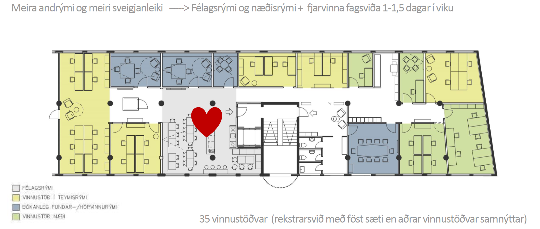 Þessi ráðstöfun er þó hugsuð til bráðabirgða, enda er pláss á hvert stöðugildi komið langt undir gefin viðmið. Engu að síður fer vel um alla og sérstaka gleði vekur félagsrými (hjarta) stofnunarinnar sem margfaldaðist að stærð við breytingarnar.