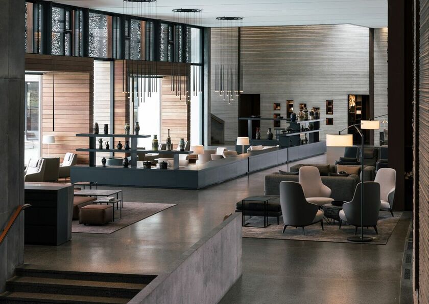 Steinsteypan í nýju hóteli og heilsulind Bláa Lónsins nýtur sín vel á mörgum stöðum í byggingunni, að innan sem utan, að mati dómnefndar sem telur að einstaklega vel hafi tekist til við framkvæmd á mynsturveggnum sjálfum.
