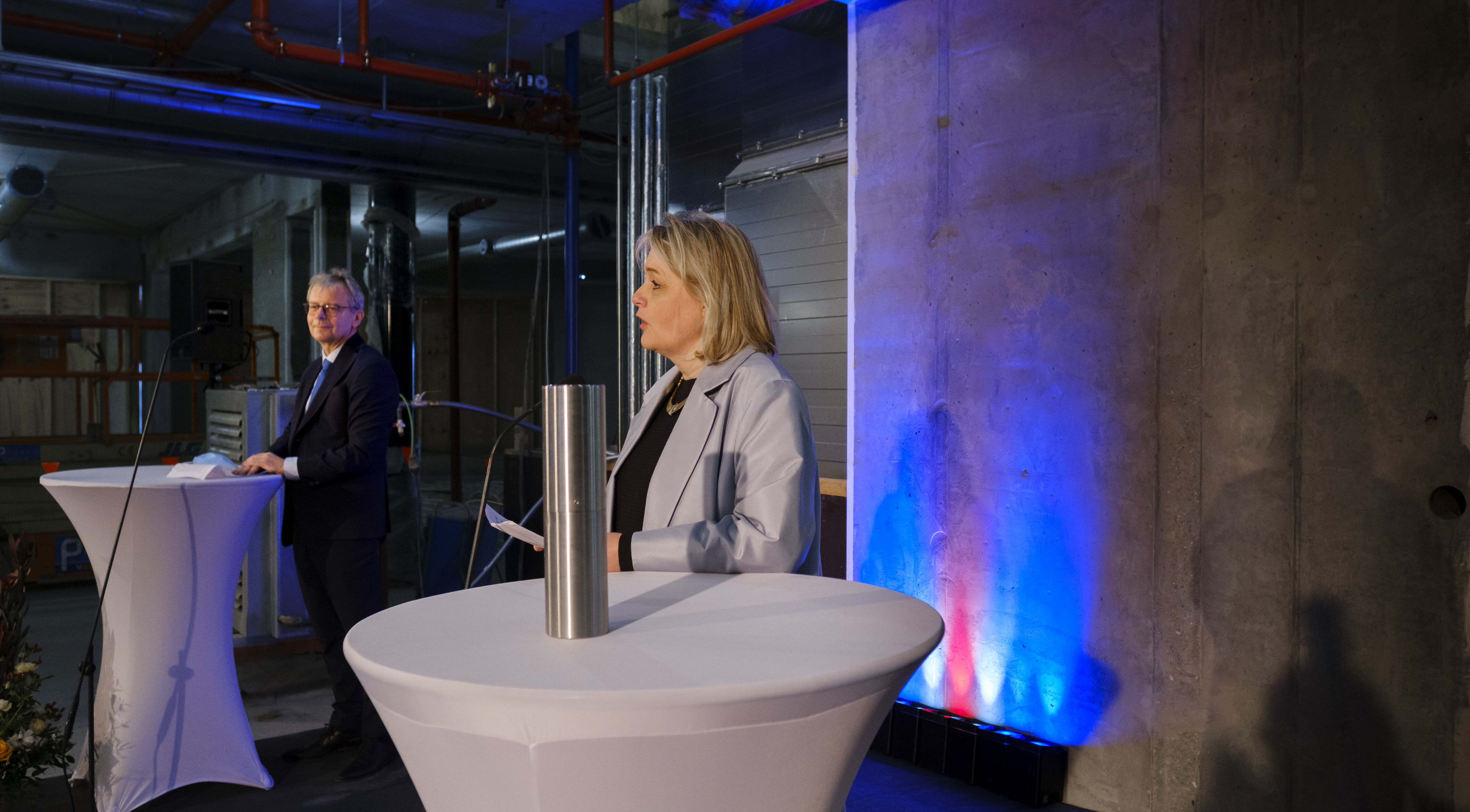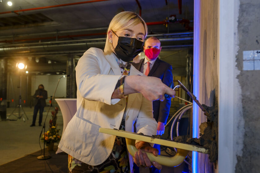 Forseti Íslands, herra Guðni Th. Jóhannesson og Lilja Dögg Alfreðsdóttir, menntamálaráðherra lögðu í sameiningu hornstein í vegg þess sem verða mun bókasafn Árnastofnunar.