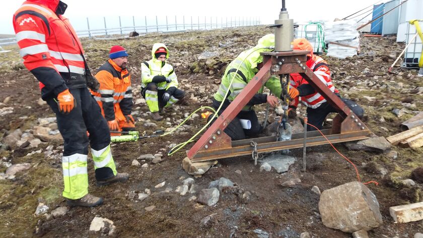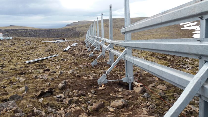 Búið er að setja aðra snjósöfnunargrindina niður og ná bergfestur hennar 3 metra niður í jörðu. Bergfesturnar eru festar með þar til gerðri steypu. Togpróf var gert til að kanna hvort steypan standist ekki ákveðið álag eða 40 kN. Ekkert gaf eftir í togprófinu og steypan stóðst mun meira álag en til var ætlast.
