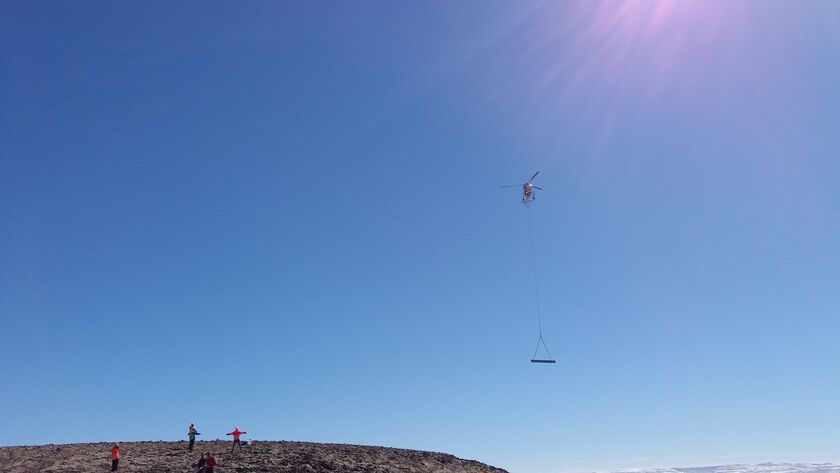 Efni í snjósöfnunargrindur, vindkljúfa og vinnubúðir var híft upp með þyrlu á fjallið fyrir ofan Brellur á Patreksfirði á sunnudaginn.