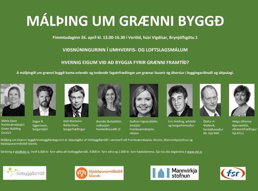 Stórglæsileg dagskrá er komin fyrir Vistbyggðardaginn / Málþing um grænni byggð fimmtudaginn 26. apríl nk. í Veröld - húsi Vigdísar. Guðrún Ingvarsdóttir, forstjóri FSR, verður með erindi ásamt öðrum innlendum og erlendum fagaðilum.