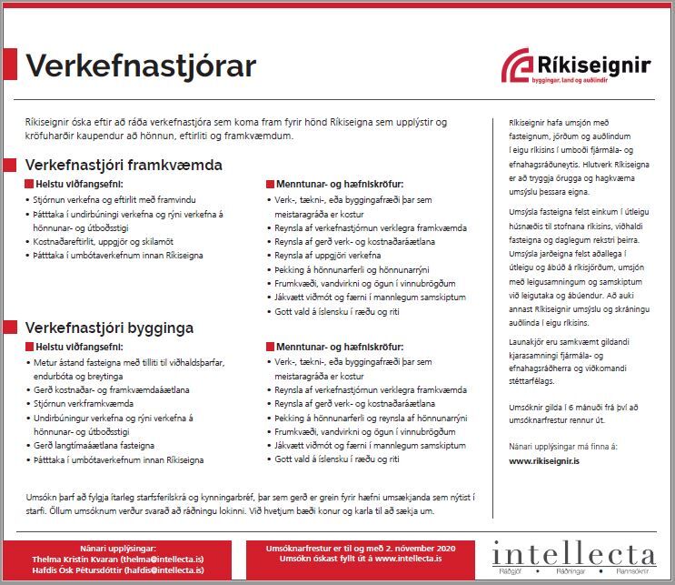 Ríkiseignir óska eftir að ráða verkefnastjóra sem koma fram fyrir hönd Ríkiseigna sem upplýstir og
