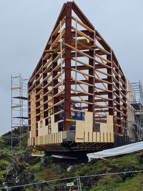 „Byggingin er í laginu eins og skip. Það kallar á flókið stálburðarvirki sem kostaði mikil heilabrot í hönnun, smíði og uppsetningu. Til viðbótar hangir hluti hússins „í lausu lofti“ – hluti gólfplötunnar hefur engan styrk frá sökklum. Þetta kallaði á eftirspennta plötu þar sem vírbarkar eru lagðir í steypumótið og strekkt á til að halda spennu í plötunni. Þetta er eitthvað sem við hjá Húsheild höfum ekki gert áður, en var spennandi viðfangsefni.“