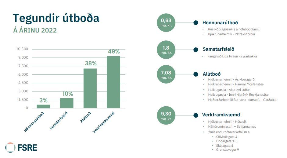 Stærstur hluti útboða FSRE á árinu 2022 verða annað hvort verkframkvæmd eða alútboð. Munar mestu um útboð vegna verkefna í heilbrigðisþjónustu, en útboð í samstarfi við heilbrigðisráðuneyti verða um 10 milljarðar króna. Munar þar mestu um stór hjúkrunarheimilisverkefni og heilsugæslustöðvar.